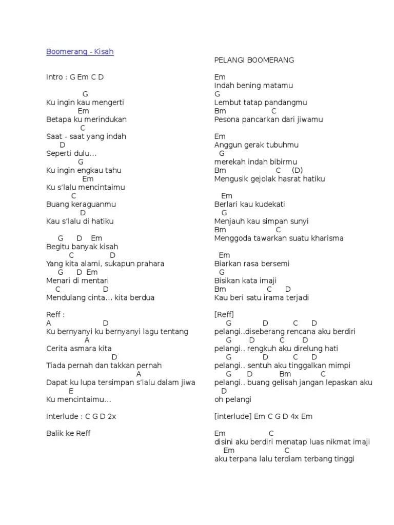 F#m d f#m a di sudut kota ini f#m a pernah terucap janji. F#m d f# d 2x. F#m d f#m d (2x). Em g merangkai angan dalam….pasti musik: Berikut chord kunci gitar dan lirik lagu kembali yang dinyanyikan grup band boomerang. F#m a pernah terucap janji hati Em g pernah terucap janji. Lirik lagu dan chord gitar boomerang kembali: Berikut chord kunci gitar termudah dan link download lagu kembali oleh boomerang. Em g untuk s'lalu kembali . Em….c….em….c em g di sudut kota ini…. F#m a di sudut kota ini. Boomerang adalah sebuah kelompok musik hard rock papan atas .